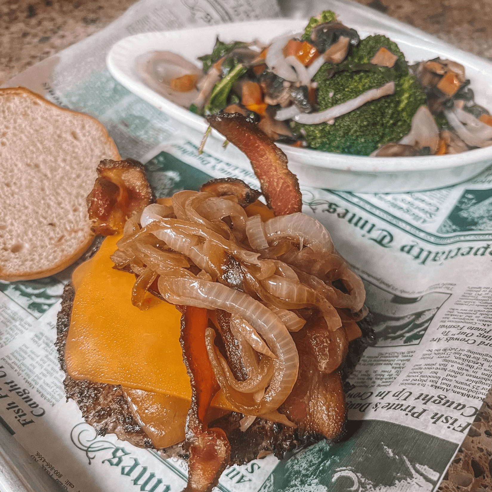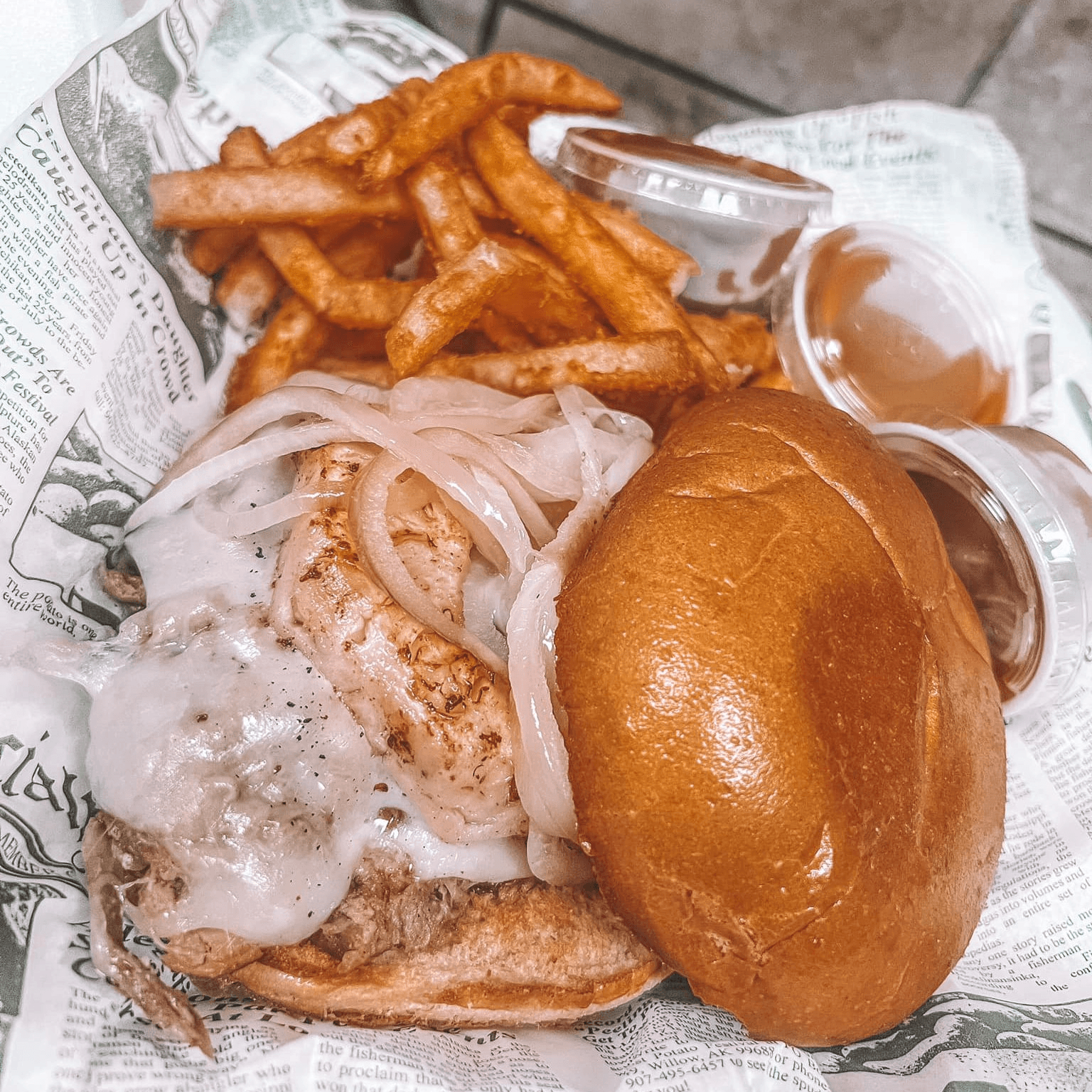 Angus beef, cheddar cheese, grilled onions, bacon, on a brioche bun