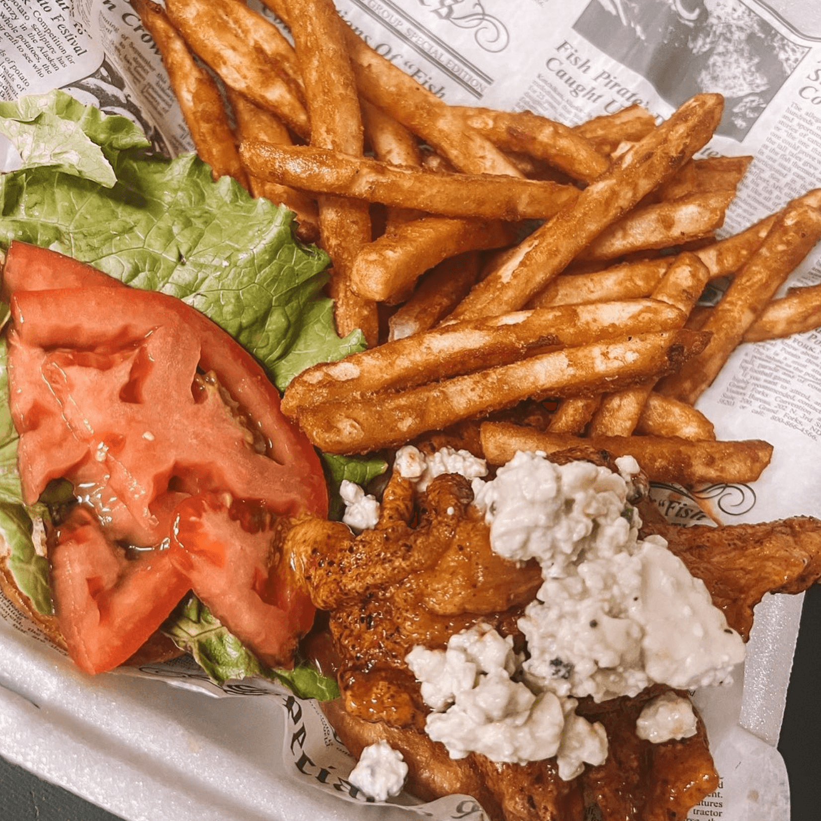 Chicken breast fried and tossed in a mild buffalo sauce, topped with lettuce, tomato, and blue cheese crumbles, served on a brioche bun