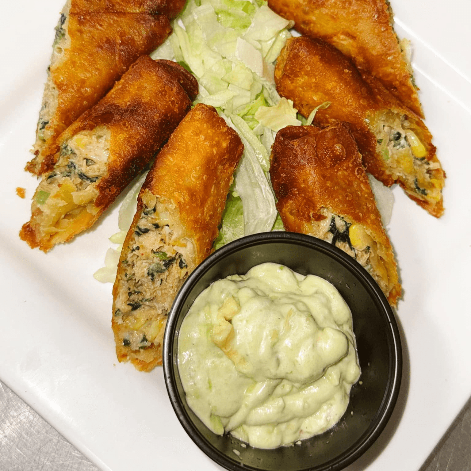 Chicken, spinach, corn, black beans, bell peppers, jalapeños, and American cheese wrapped in a crispy tortilla & fried