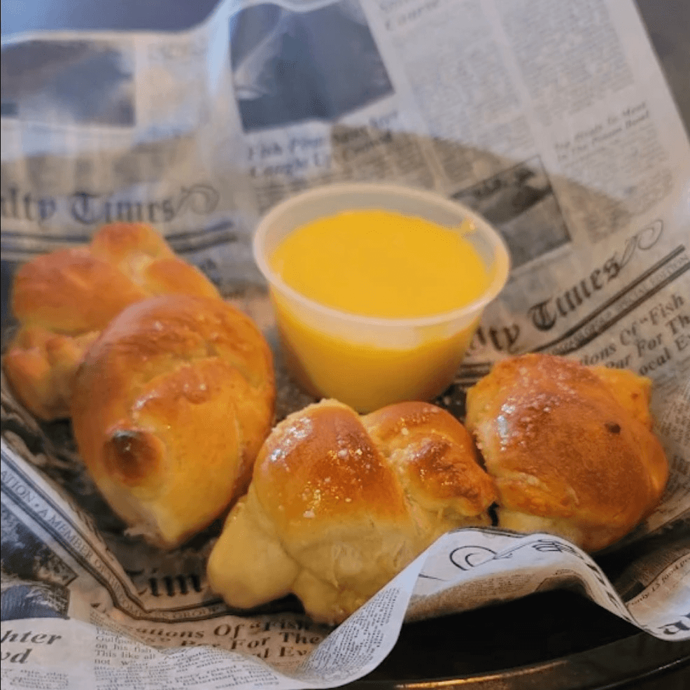 Fresh made pretzel knots served with cheddar sauce