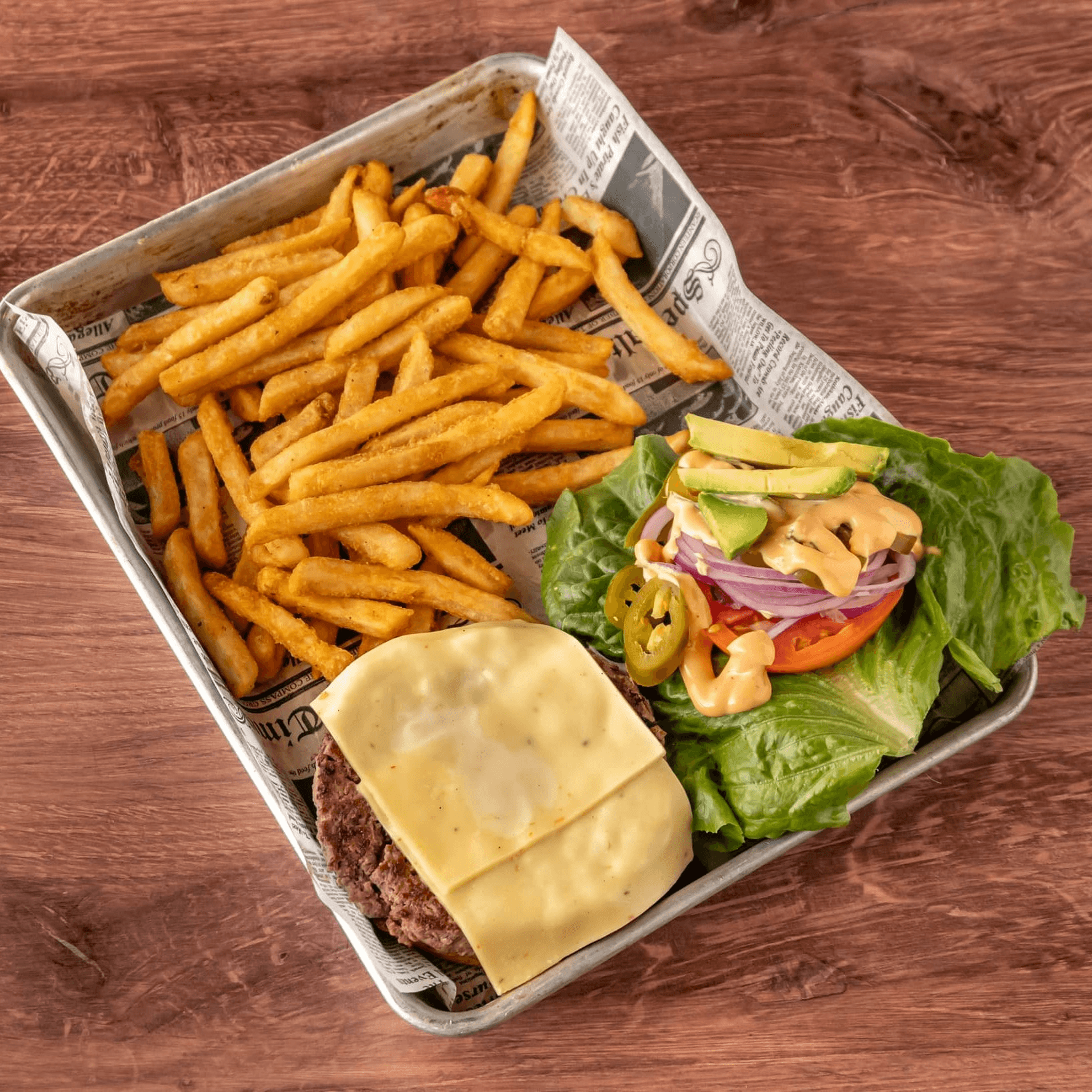 Angus beef, pepper jack cheese, lettuce, tomatoes, avocados, red onions, jalapeños and chipotle aioli
