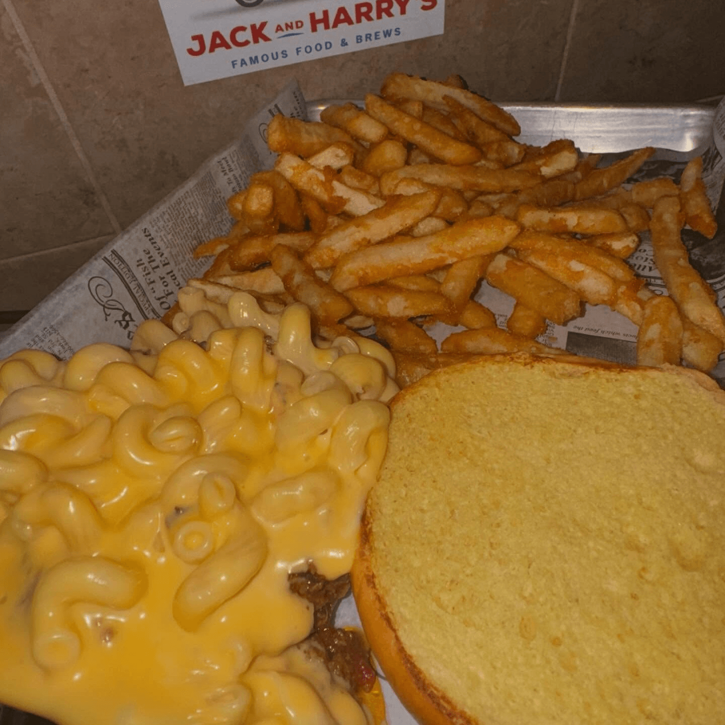 Brioche bun with our homemade sloppy joe mix, topped with mac n cheese