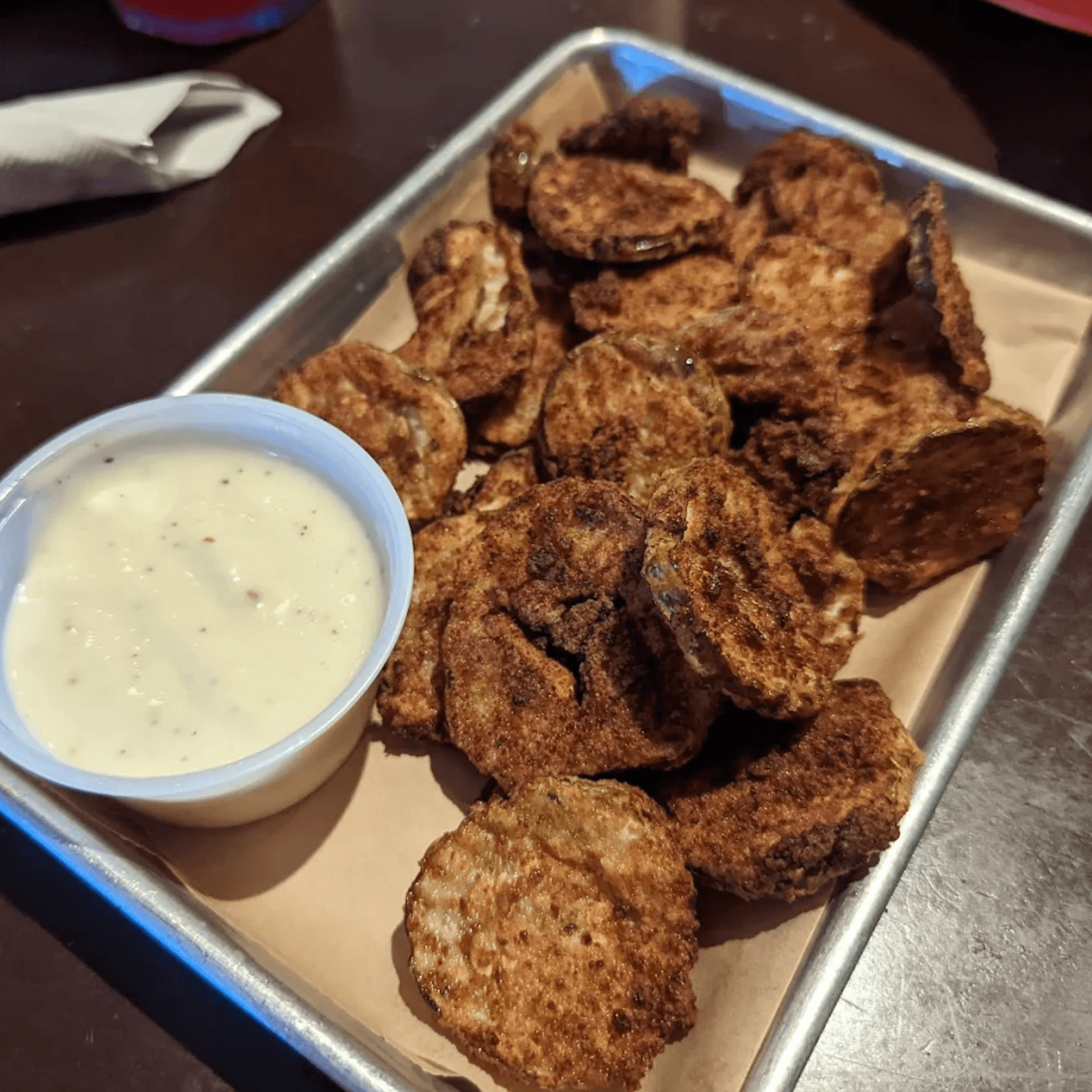 Pickle chips served with a tangy sauce