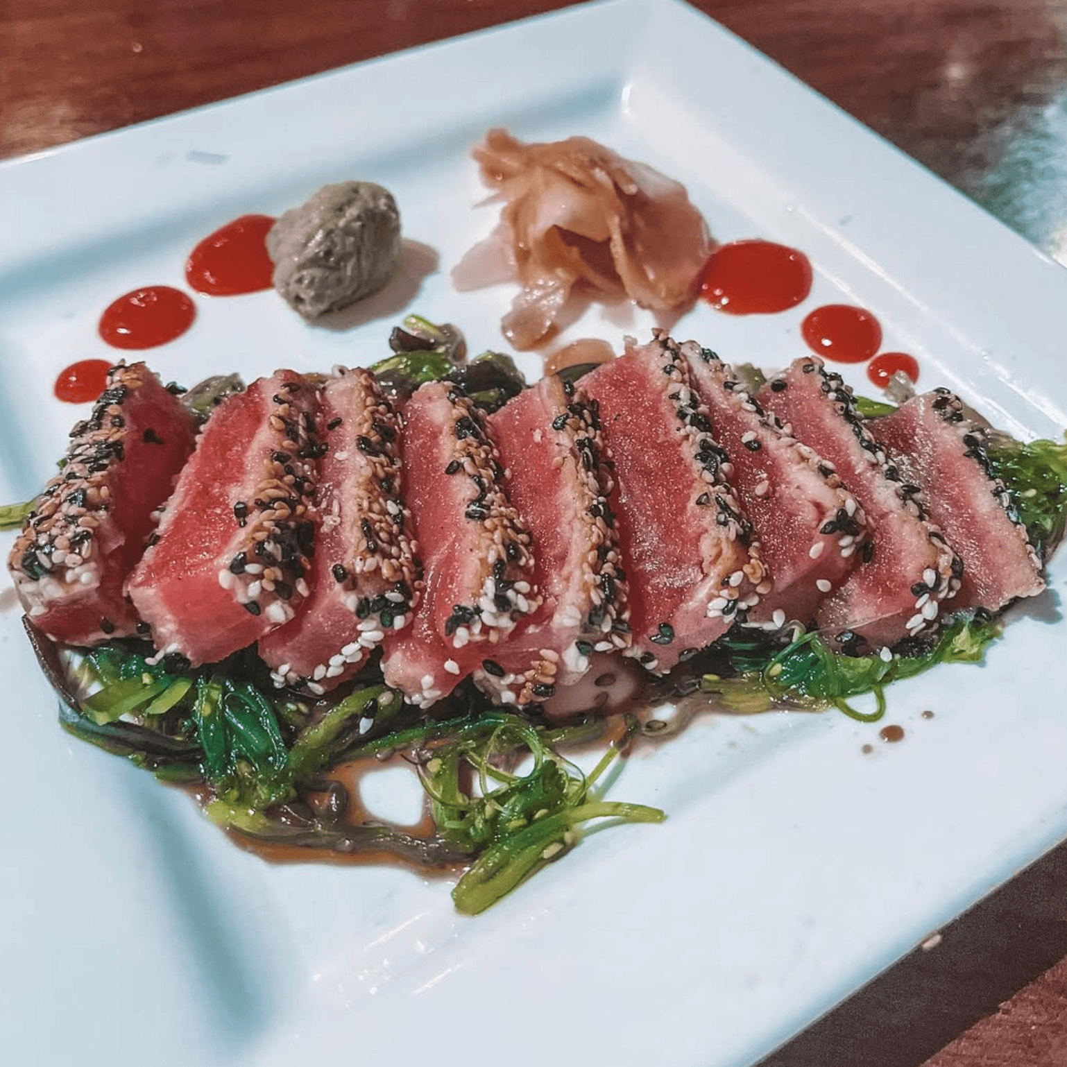 Seasoned sesame seeds, seared rare, thin sliced, soy glaze, and served over a bed of seaweed salad with soy sauce, ginger, and wasabi