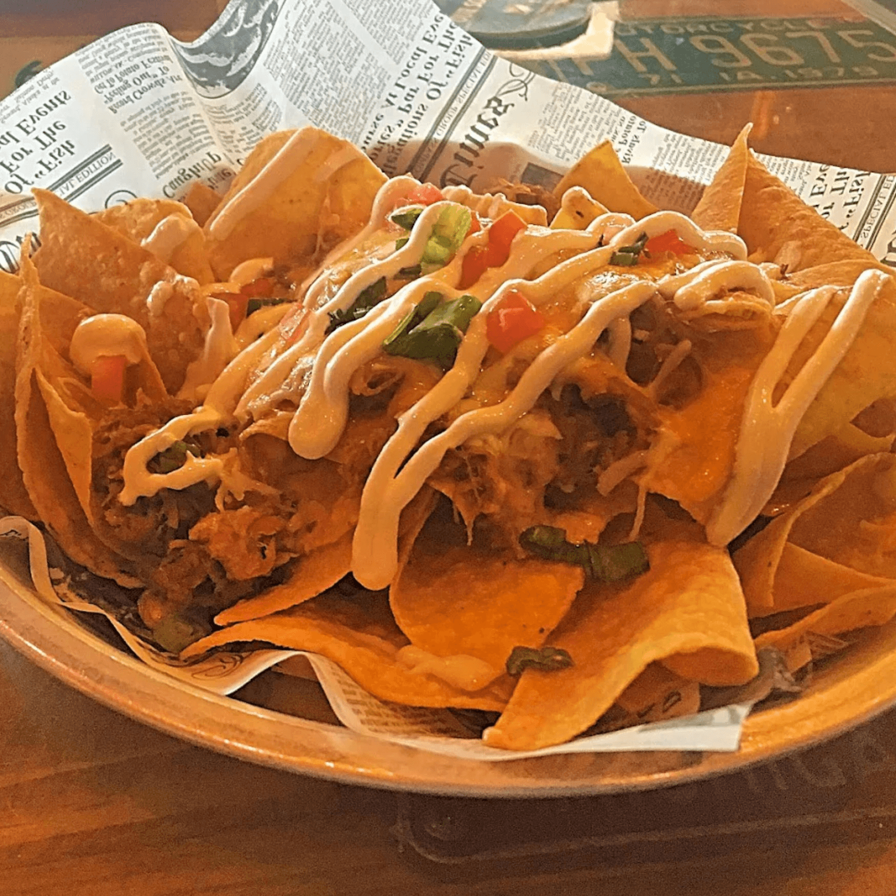 Tater tots with a cheese sauce, fiesta beef, diced tomatoes, green onions, sour cream and chipotle aioli